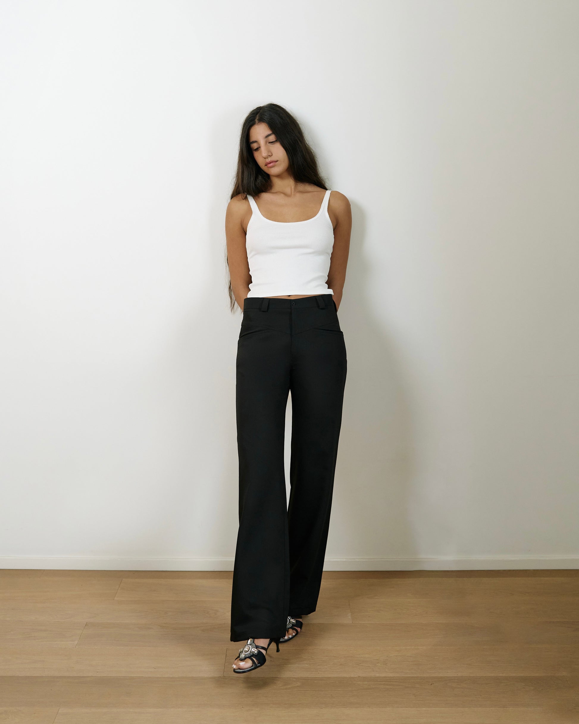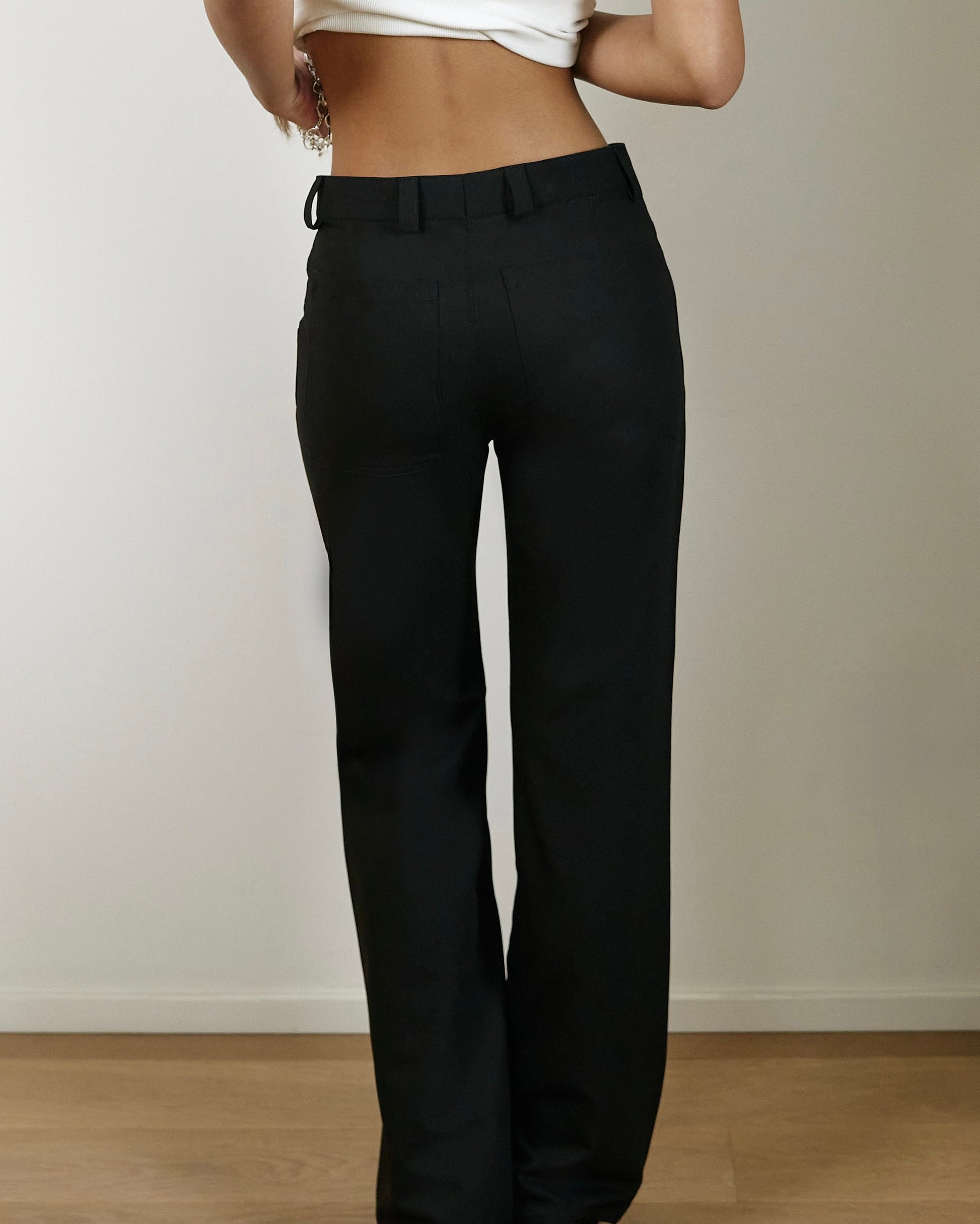High-waisted black tailored pants with pockets, a straight-slim fit and a subtle flare at the hem.